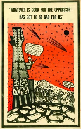 Emory made the newspaper covers and art inside the pages. He made a full back cover, which was often reprinted separately in full color. These were pasted on buildings, walls, windows, telephone poles in the community. It was art to see yourself in, to see the common struggle in.